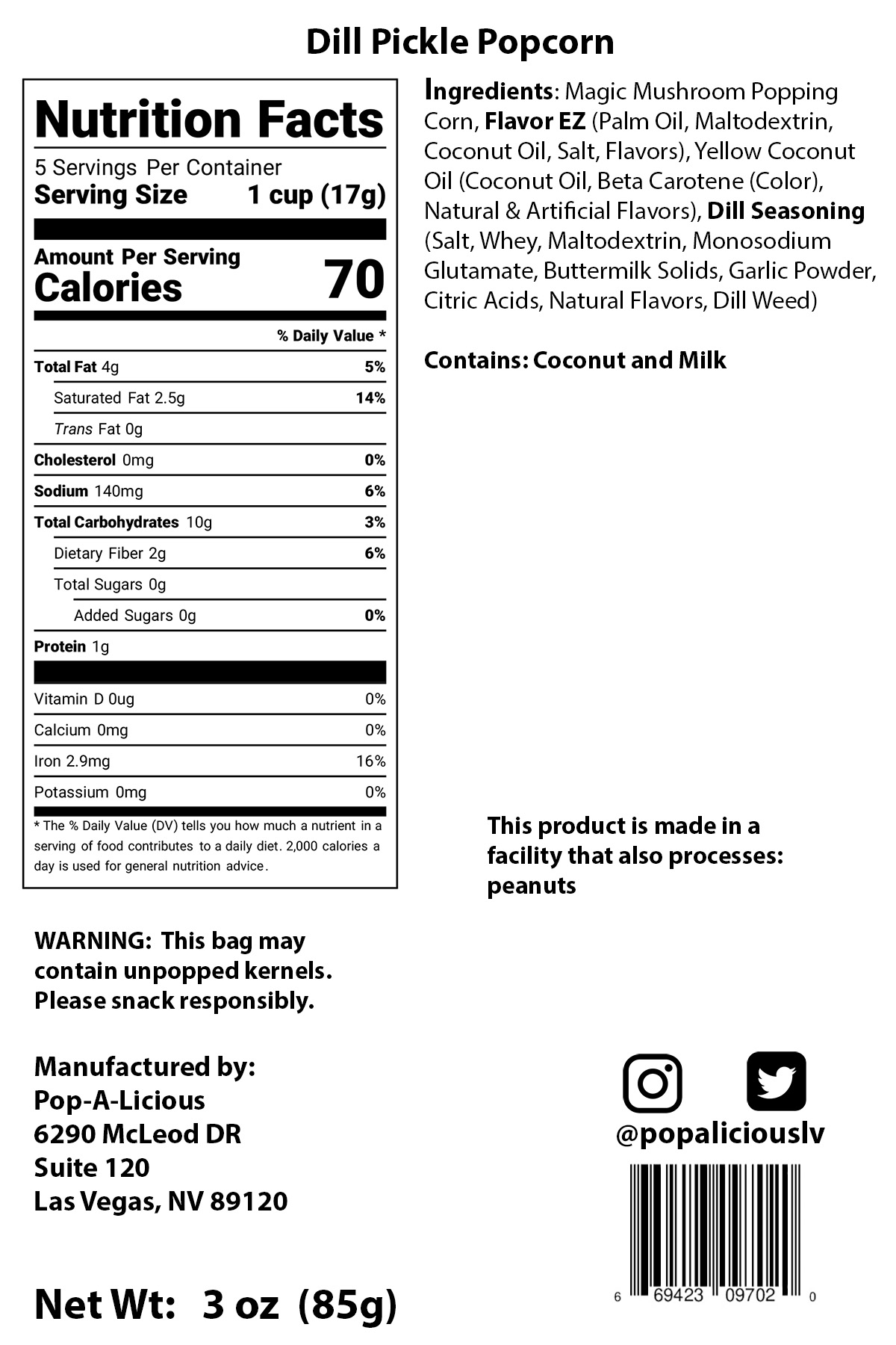 Indulge in this savory taste of Pop-A-Licious Dill Pickle popcorn. Handcrafted with bright dill, tangy vinegar, and savory seasoning, this gourmet popcorn offers an irresistibly bold pickle flavor experience. Allergens include coconut and milk, so be mindful of any dietary restrictions.
