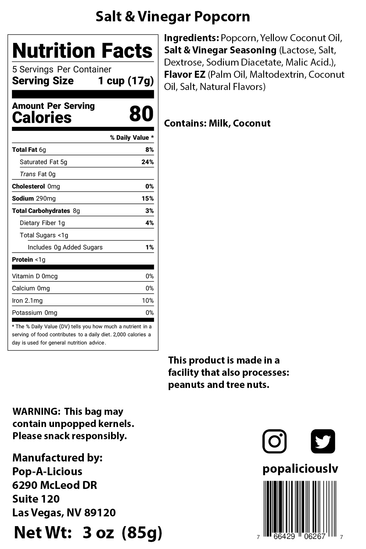 Indulge in this taste of Pop-A-Licious Salt & Vinegar popcorn. Our salt & vinegar popcorn combines sharp, tangy vinegar with a delicate salt finish, creating a gourmet snack with unforgettable flavor. Allergens include milk and coconut, so be mindful of any dietary restrictions.